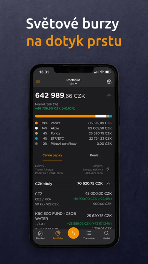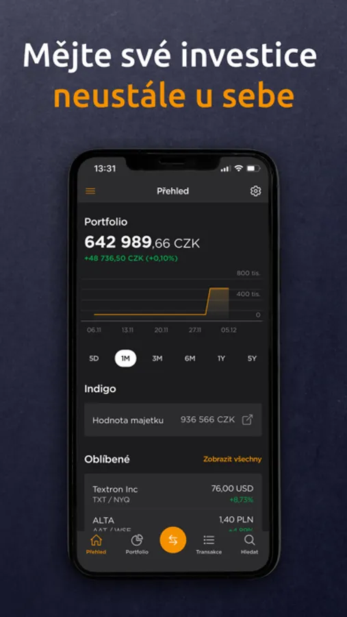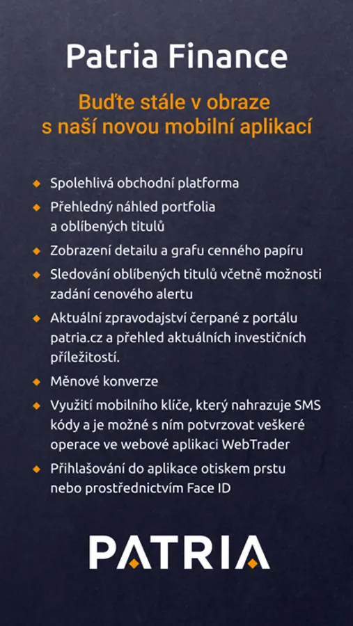 Mějte svůj obchodní účet u Patria Finance pod kontrolou 24 hodin 7 dní v týdnu! S novou mobilní aplikací společnosti Patria Finance budete mít vždy okamžitý přehled nad svým portfoliem a nad veškerými svými transakcemi na burze. Díky možnosti nastavit cenový alert už vám nikdy neuteče důležitý obchod, nákupní a prodejní pokyny nyní můžete zadávat přímo z nativní obchodní aplikace. Na dosah ruky máte obchodování s akciemi, ETF, ETC, certifikáty a dalšími třídami aktiv. Nová mobilní aplikace také obsahuje možnost ověřování operací prováděných ve webové aplikaci tzv. mobilním klíčem a nahrazuje tak SMS kódy. A k tomu všemu nabízí i exkluzivní zpravodajství a videa z portálu Patria.cz.