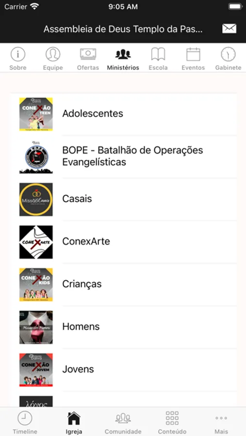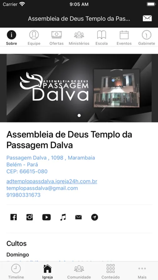 - Informações da Igreja (endereço, telefone, site, redes sociais, pastores)