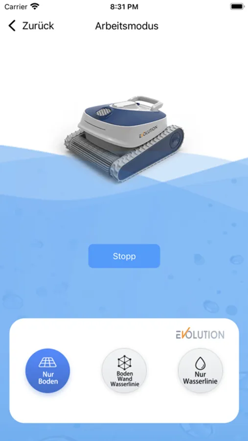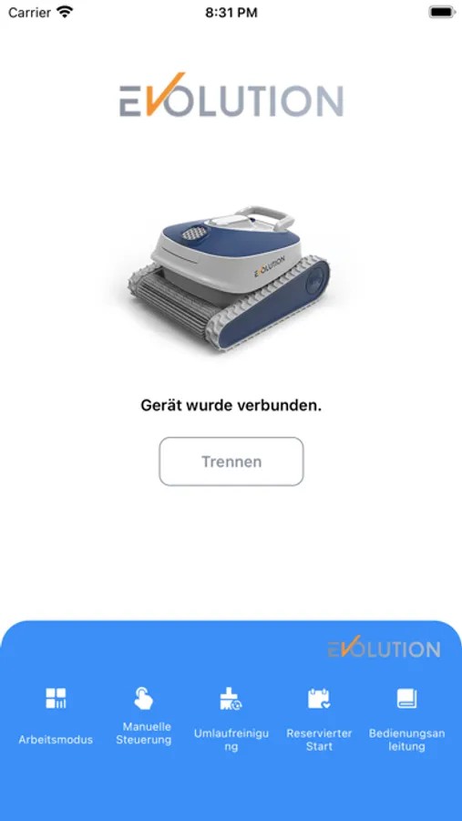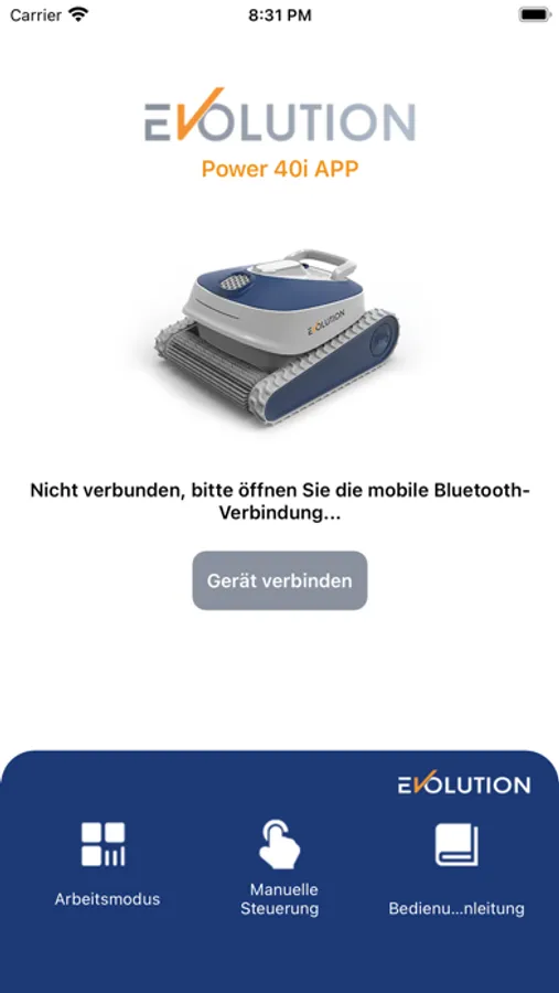 Die Evolution 40i App ermöglicht eine Einstellung und Steuerung des gleichnamigen Poolroboters bequem über das Smartphone. Über das intuitiv zu bedienende Menü lassen sich verschiedene Reinigunsprogramme auswählen oder das Gerät manuell in alle Richtungen navigieren.