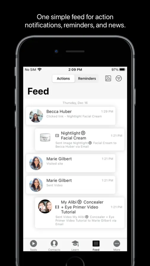 Contacts: Choose how to sync and manage your contacts. Swipe to sort them by interest level. You can make connections, add notes, or check out the Contact Feed to see the tools you’ve shared and contact actions.