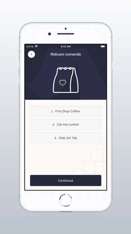 Descărcarea aplicației noastre vă va oferi opțiunea de a comanda în avans, înainte de a ajunge la unul dintre locurile noastre. Puteți selecta locația în care ne veți vizita. În grabă? Spuneți-ne și vă putem aduce cafeaua într-unul din punctele noastre de întâlnire.