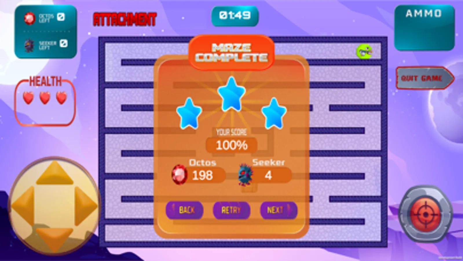 Maze Runner - Collect Octos and eliminate enemies to get 2-3 stars to complete the level. Each level will contain different amount of Octos and enemies. You will have 3 minutes 30 seconds and 3 lives to complete the level. Please note, collected Octos in free MazeRunner game mode won’t be added to main count.