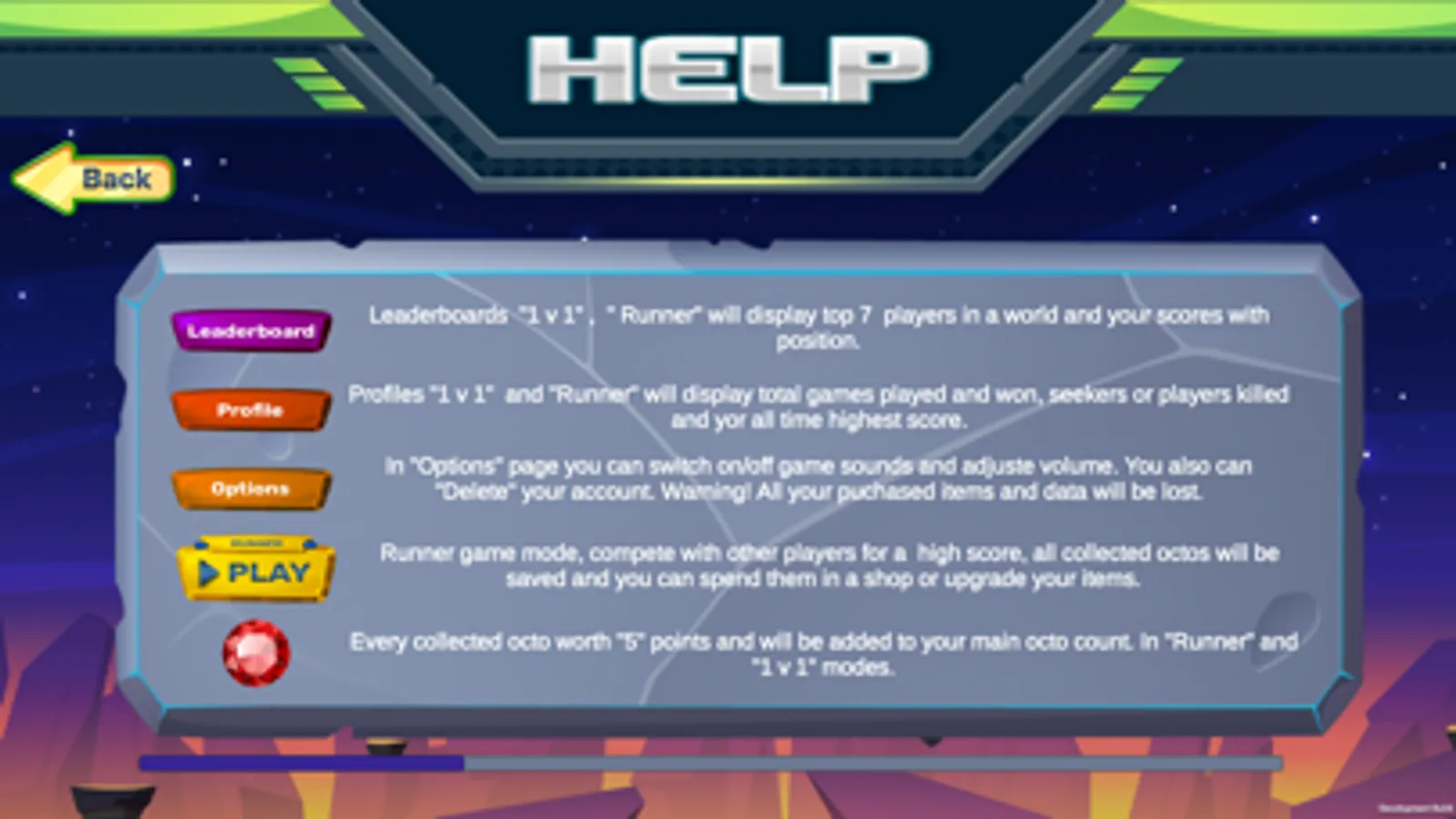 Multiplayer - Compete in 1 v 1 battle. Pick up your weapon and survive longer then opponent, first player to loose three lives or leave the game Looses. When your bullets are gone you'll need to find an ammo box so use them wisely, ammo box will spawn randomly every 30 seconds. Avoid enemies and opponent on a way. Points are added for every enemy or opponent killed and each Octo you collect, but be careful as points will be deduced for collisions with enemy or if you get shot by opponent. If both players survive till the end of time the winner will be with the higher score.