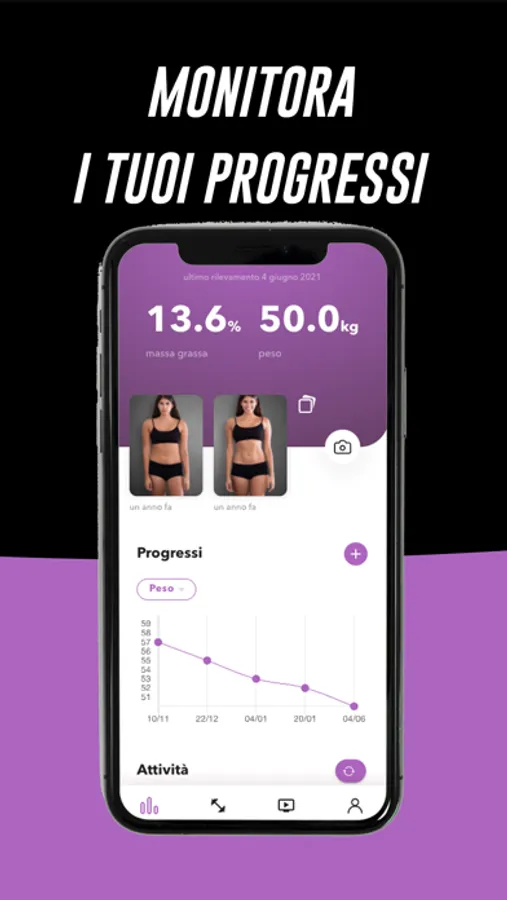 Avrai sempre sotto controllo la tua attività fisica: potrai visualizzare quali esercizi sono previsti nel tuo piano di allenamento, i tuoi progressi e come cambia il tuo fisico nel corso del tempo.