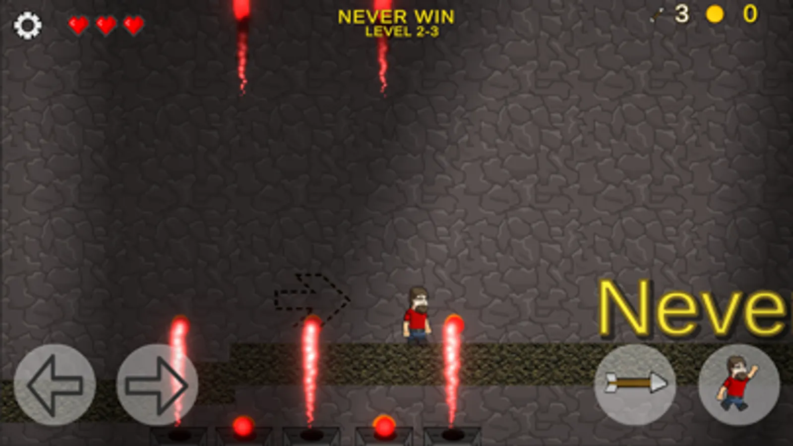 Never Win is a platform game like Super Mario Run, Sonic Dash - Endless Running, Super Jack's World, Syobon Action, and many other games, levels will become harder as you level up, it's a very hard game.