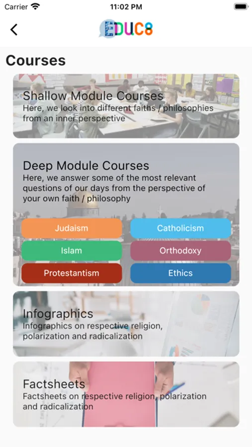 EDUC8 is a free app that helps to build resilience against radicalisation and polarisation through religious education. Forming an outcome of the EDUC8 Project which is funded by the EU, EDUC8 App offers a selection of courses for secondary school teachers and students. The content is in English, French and Dutch for the followers of six faiths / life philosophies, namely Judaism, Catholicism, Islam, Orthodoxy and Protestantism, and non-confessional ethics.