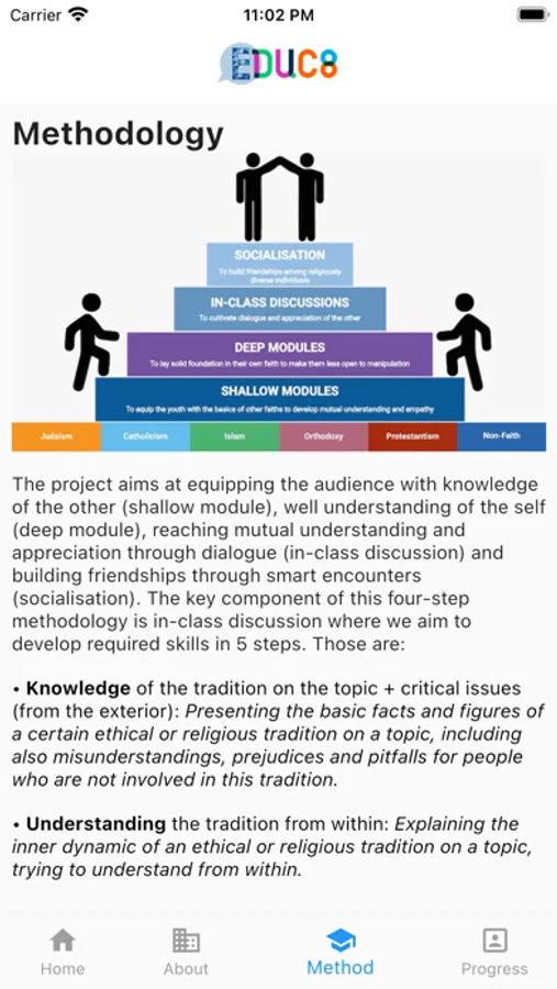 EDUC8 methodology aims at equipping the audience with knowledge of the other (shallow module), well understanding of the self (deep module), reaching mutual understanding and appreciation through dialogue (in-class discussion) and building friendships through smart encounters (socialisation). The content in the app is designed in a way to support implementation of this methodology.
