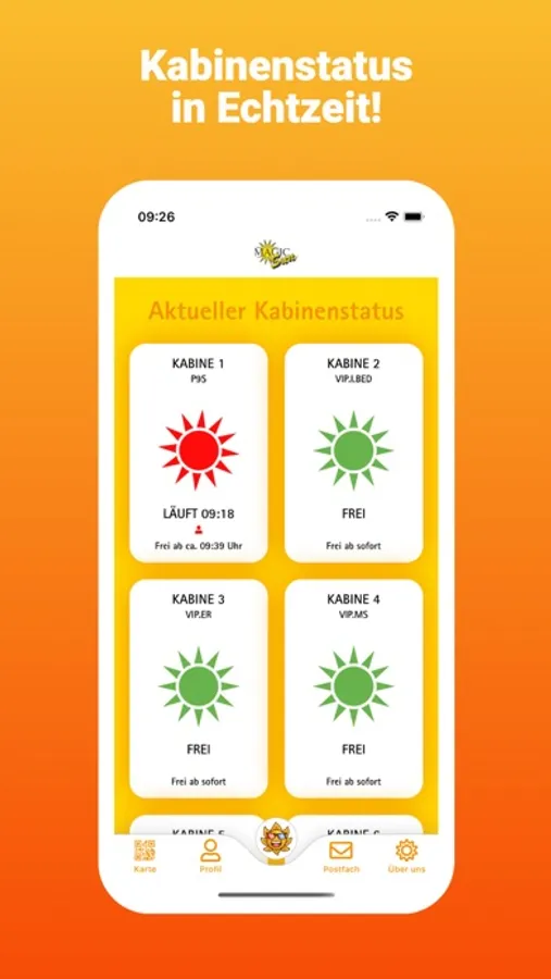 Die App bietet dir neben aktuellen Angeboten, Öffnungszeiten, Aktionen und Informationen, auch den augenblicklichen Kabinenstatus in Echtzeit, von deinem MagicSun. Somit weißt du immer, ob, oder wie lange, deine Lieblings-Sonnenbank noch läuft.