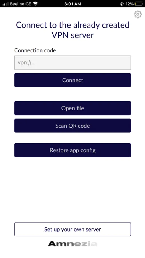 - connect by connection code, by config file, scanning a QR code, restoring a backup config if you have one, or setting up your own VPS server.