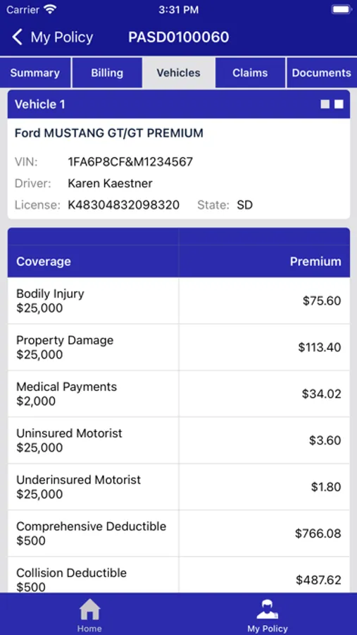 - Vehicle(s) description: VIN, driver, license # and licensing state, coverages, and limit Information