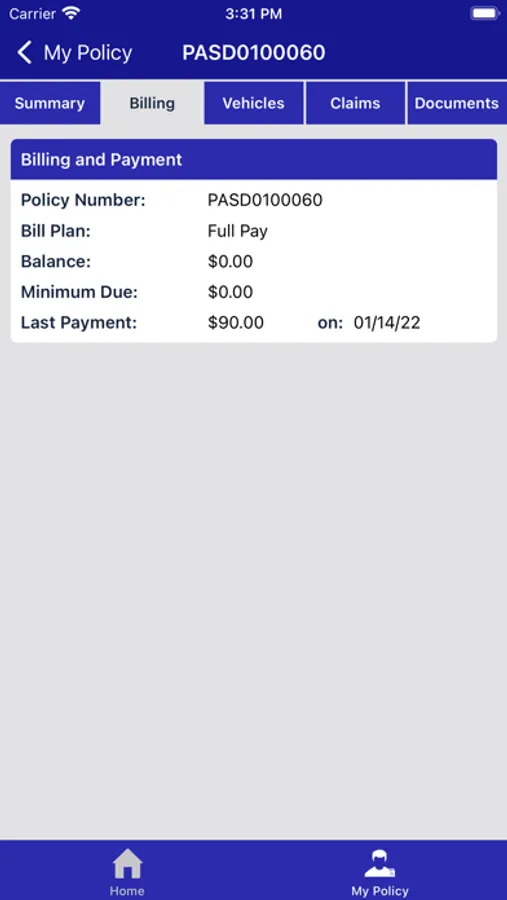 - Summary – view policy and coverage details including effective and expiration date, next activity alerts when payment is due