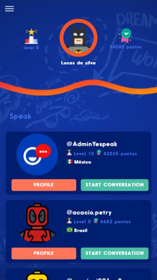 A comunidade YeSpeak foi criada para que você possa praticar inglês com pessoas de todo o mundo, desenvolvendo conversas a partir de roteiros com diversos temas e ampliando seu vocabulário.
