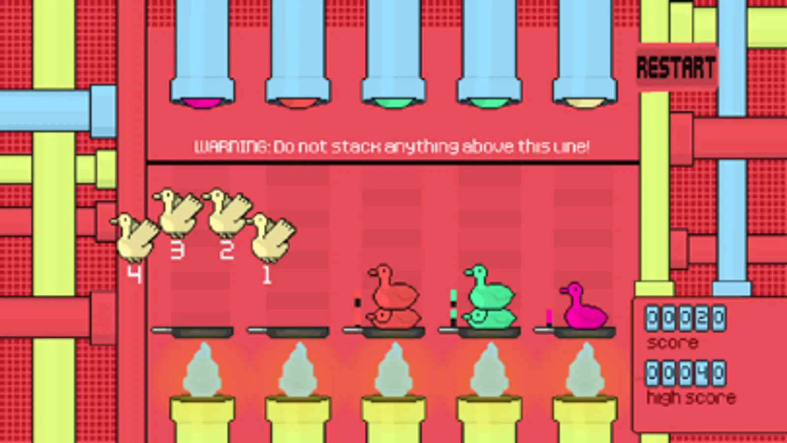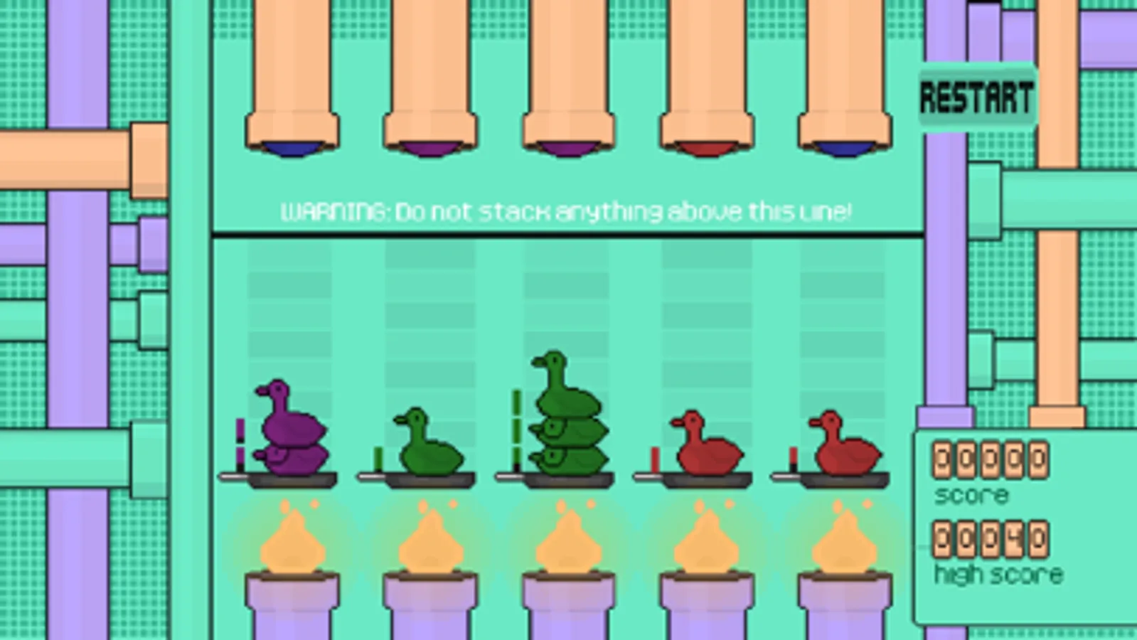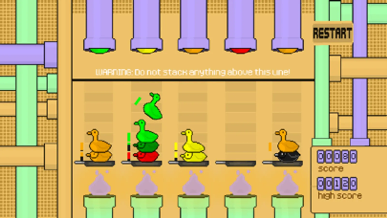 Wrack your brain in this puzzle game. Stack matching ducks before they burn to score points. Beware, if you stack too high, the stack will topple and everything will be ruined! See how high you can get your score.