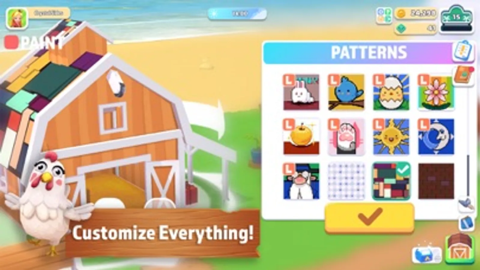 * Everything on the farm can be placed freely and they all have their own characteristics, such as fences that will stop chickens from running around, street lights that automatically light up the farm at night, and pavement that provides safe walkway for your avatar.