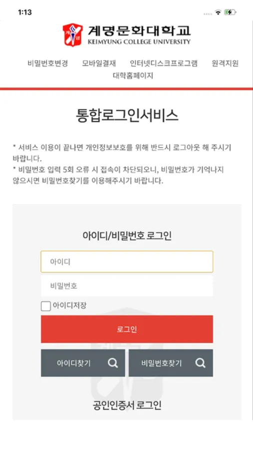 1. 로그인 시 필요한 서비스의 ID 및 비밀번호는 통합정보시스템과 동일합니다.