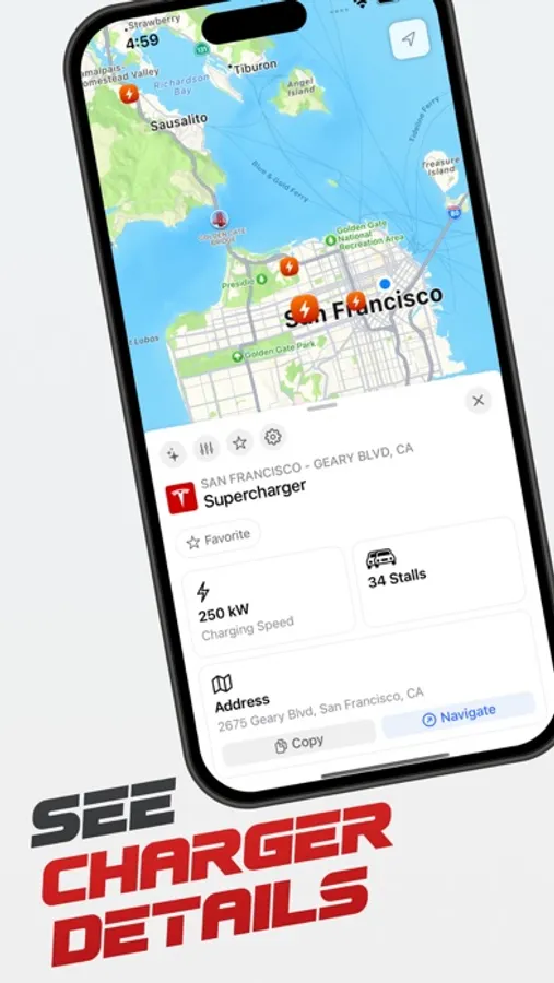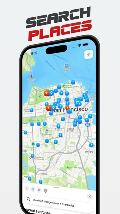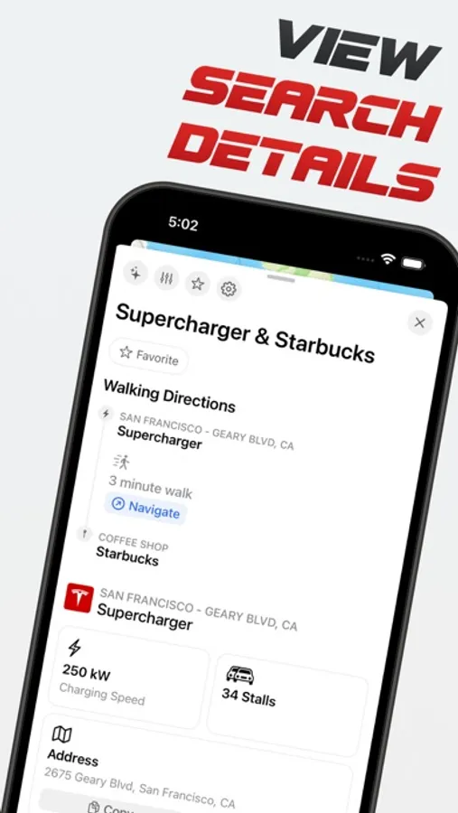 With Charge My Tesla, you can easily search for charging locations near a desired location, whether it's a Starbucks, In-n-Out burger, or any other place. Simply enter a desired location into the app, and it will show you charging stations close to that location, along with their walking distance and charger information.