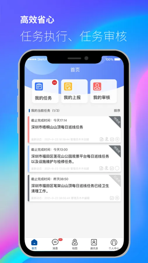 本APP完整保留了“两步路户外助手”的工具性,额外添加了包括任务完成、任务审核、公司组织框架、紧急上报等功能。