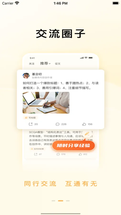 这是一款为内容创作者服务的垂直社区App,更是一款会改变你工作和生活方式的工具,集行业动态、交流圈子、学习资源、创作服务于一体,全方位服务内容创作者,通过好内容、好工具、好服务帮助创作者提高效率,助力创作者成功。