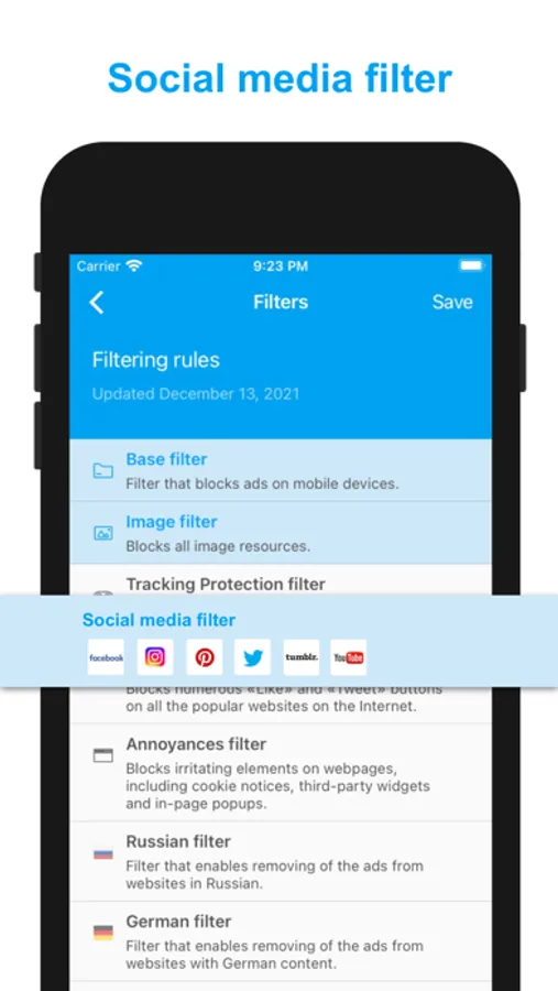 Filters that blocks numerous buttons and other social media integrations on popular websites.