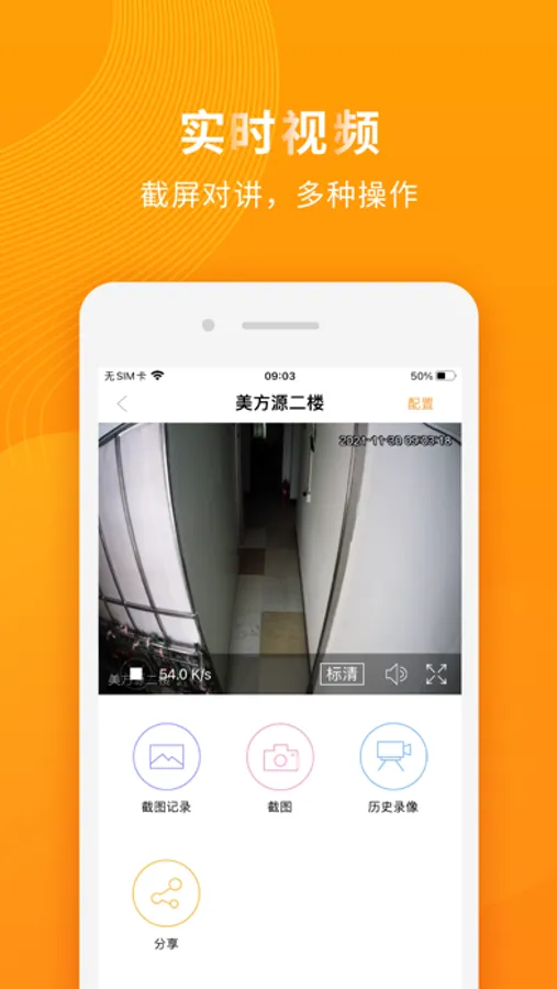 在通过网络可以查看硬盘录像机录像视频、控制摄像枪左右上下移动、通过捏合手势控制远近或球机摄像头转动获取不同的监控范围、视频截图功能。