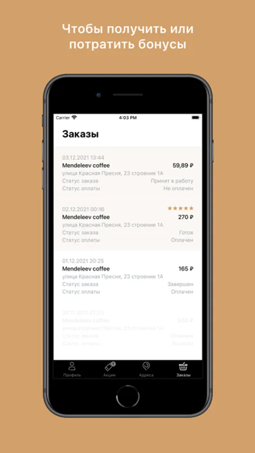 Более того, в нашем приложении вы сможете посмотреть историю ваших заказов и адреса наших заведений.