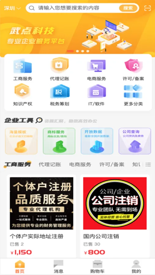 首页展示服务类型,根据服务类型提供不一的服务,让企业得到更省钱更省力的服务;