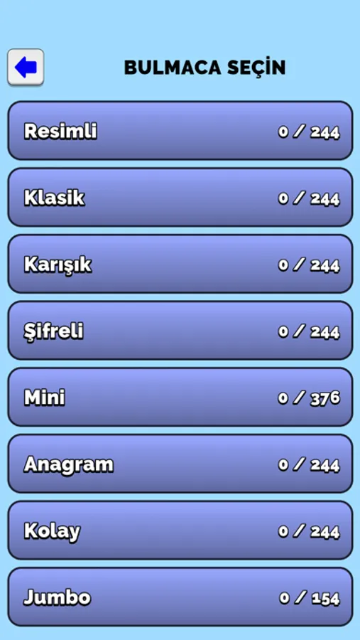 • Klasik, Resimli, Karışık, Şifreli, Jumbo, Mini, Anagram bulmacalar.