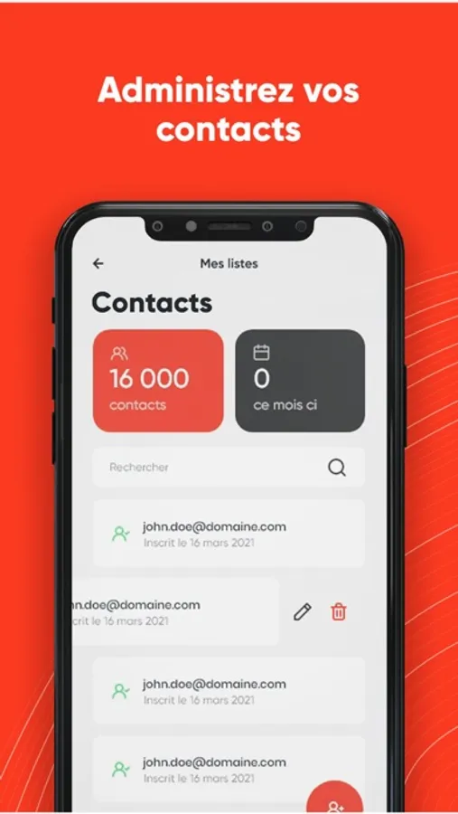 Consultez, créez et modifiez facilement vos contacts et listes de contacts à distance. Les données seront instantanément synchronisées avec votre compte Sarbacane. Ajoutez ou modifiez, par exemple, directement des contacts dans vos listes de diffusion lorsque vous êtes en déplacement, en rendez-vous professionnel ou sur un salon. L’application Sarbacane vous permet ainsi de gérer facilement les données de vos contacts et permet à vos équipes de déclencher des actions de communication spécifiques (campagne email, campagne SMS, scénario automatique, etc.) pour les contacts ajoutés ou modifiés.