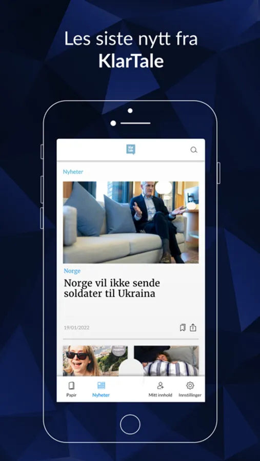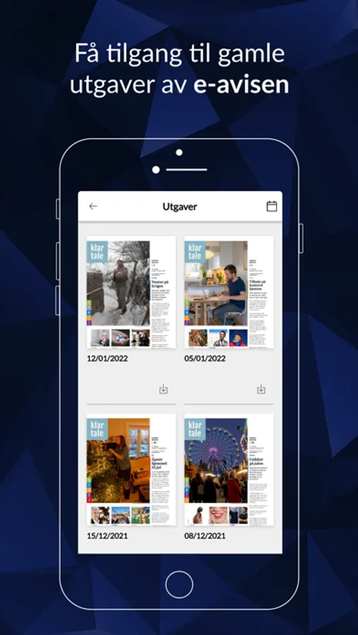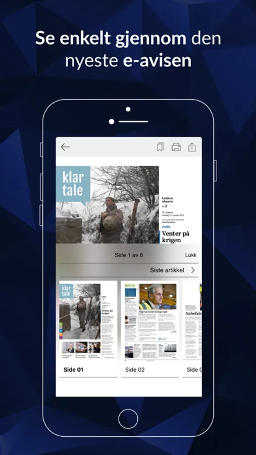 Med tilgang til Klar Tale sin applikasjon har du alltid den nyeste utgaven av papiravisen tilgjengelig. Du får tilgang til avisa kvelden før den kommer ut. Brukernavn og passord i applikasjonen er det samme som du bruker for å logge deg inn på nettsiden. Dersom du kjøper abonnement på Klar Tale, får du tilgang til Klar Tale e-avis og dagens nyheter på telefonen, nettbrett og datamaskin. Du kan også lese avisa som kommer ut hver onsdag. Større skrift og enkelt språk gjør avisa lettere å lese enn andre aviser. I avisen finner dere åtte sider med spennende saker og reportasjer.