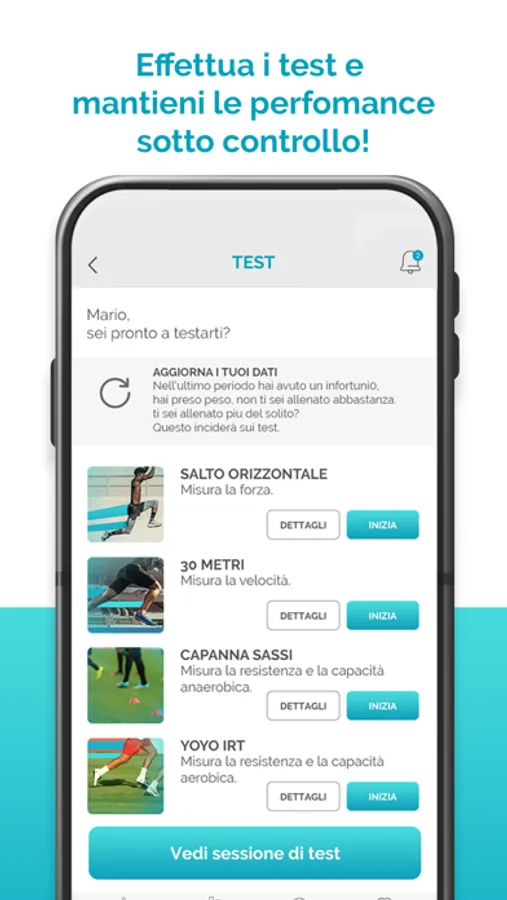 Inserisci i tuoi dati, monitora la tua performance con 4 test atletici, collegati con i tuoi compagni di squadra e tieni d'occhio le statistiche per migliorare la tua forma fisica.