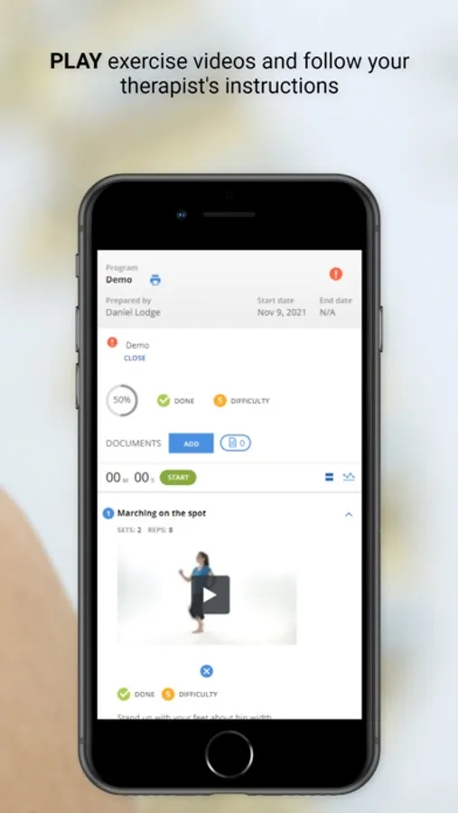 Users can monitor their progress with an interactive rating scale to track exercise completion, exercise effort and pain levels.