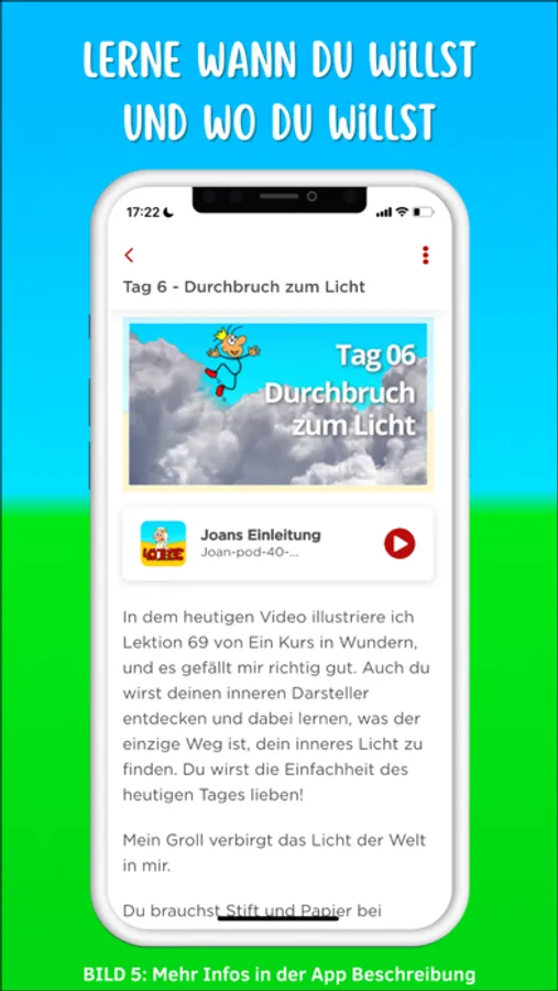 Möchtest du unterwegs offline arbeiten? Kein Problem! Lade dir zu Hause alle Lektionen herunter und höre unterwegs ganz entspannt unsere Podcasts, ohne dein Datenvolumen zu belasten. Nicht benötigte Lektionen kannst du jederzeit wieder löschen, um Datenspeicher freizugeben.