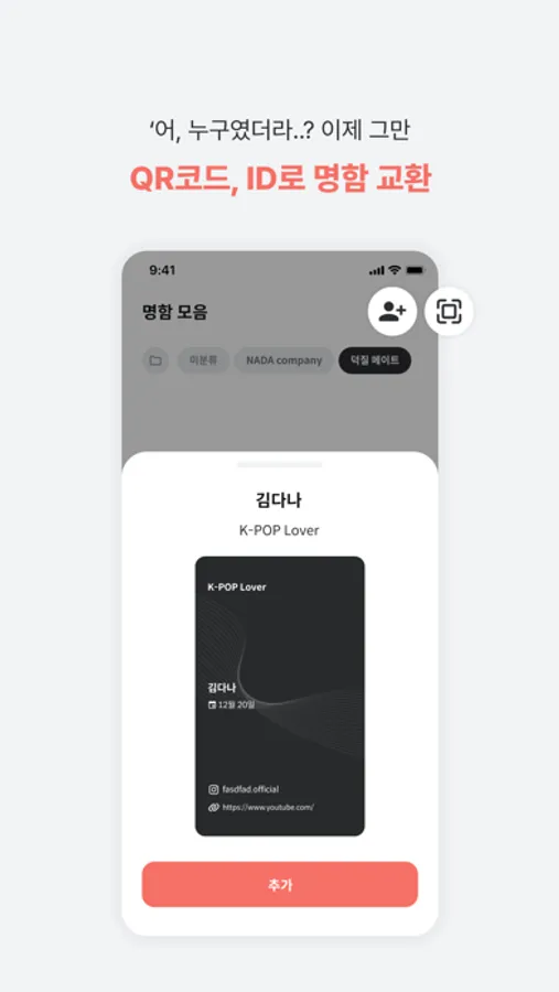 - 하나의 명함마다 QR코드, ID가 생성돼요. 상대방과 명함을 교환하며 서로를 더 잘 기억해 보세요.