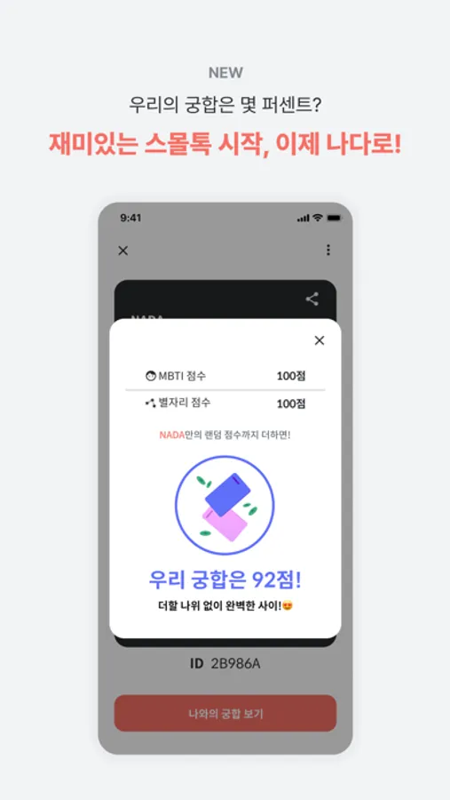 - MBTI, 별자리 등이 조합된 NADA만의 궁합 시스템으로 재미있는 만남을 가져보세요.