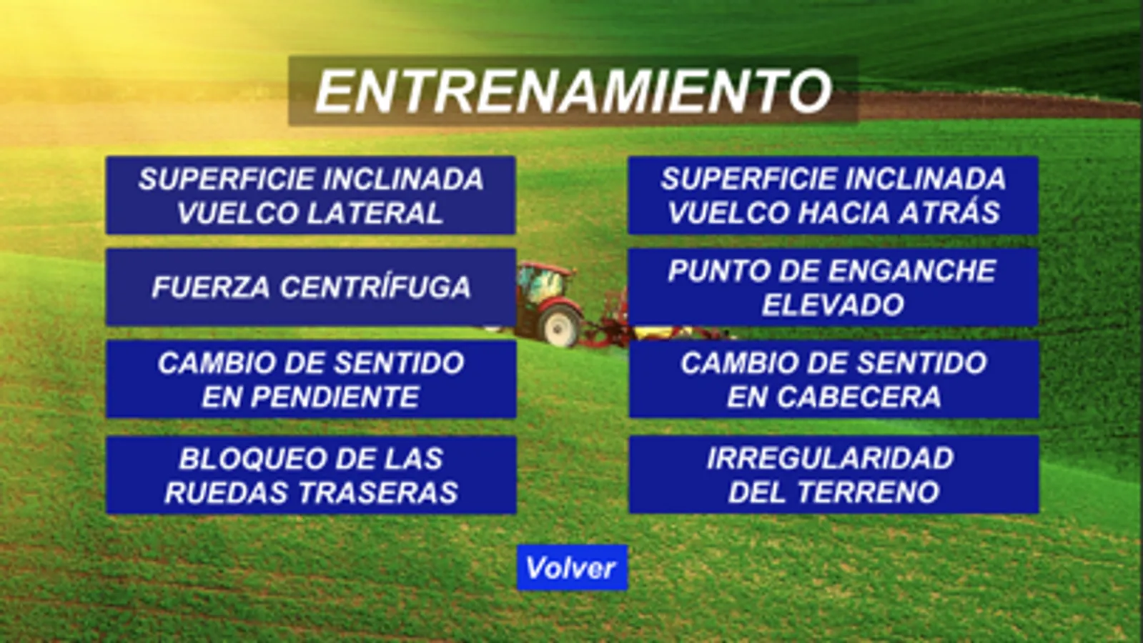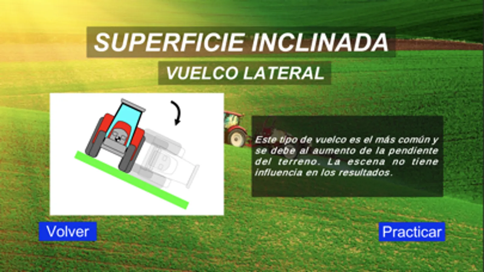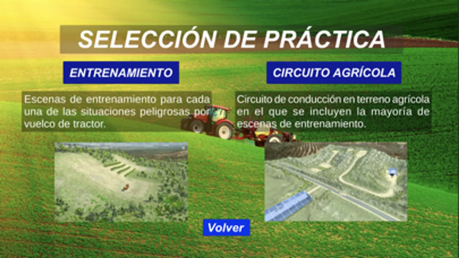 Esta aplicación es un simulador de conducción de tractor que permite formar a conductores en la conducción segura y en el uso adecuado de los dispositivos de seguridad (ROPS y cinturón de seguridad), concienciando acerca del riesgo de accidente por vuelco y reforzando las conductas seguras.