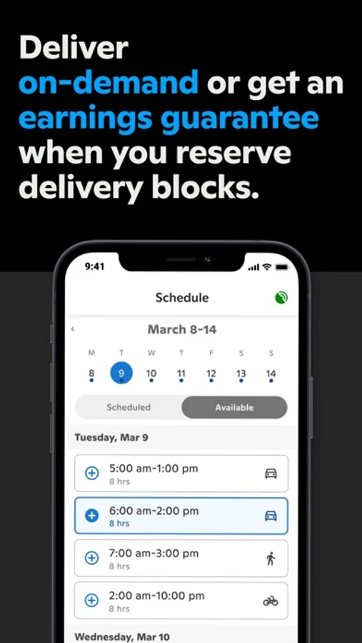 - Get a minimum earnings guarantee when you reserve delivery blocks ahead of time