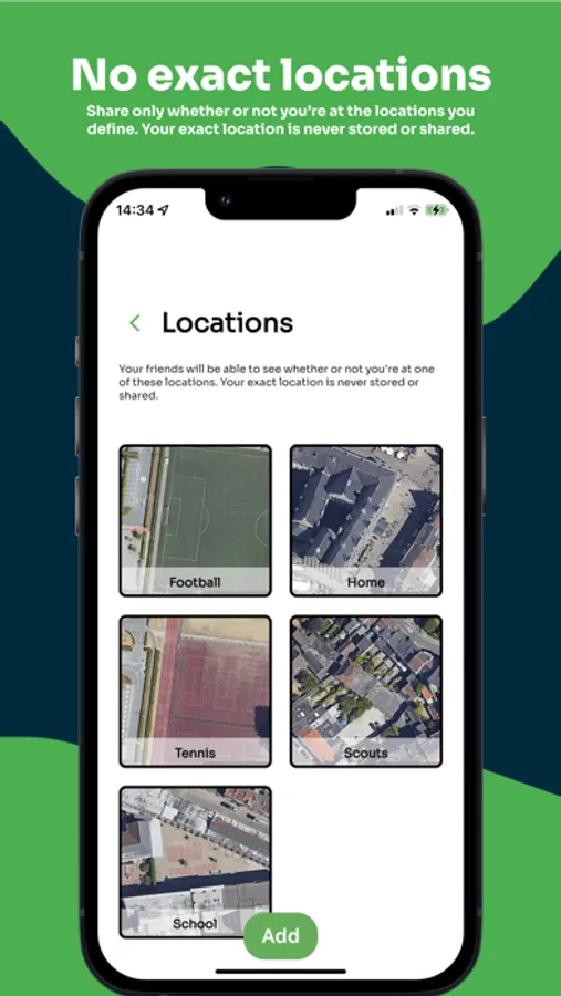 Share only whether or not you’re at the locations you define. Your exact location is never stored or shared.