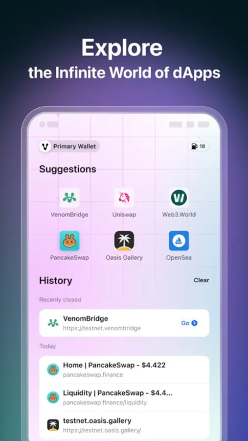 Explore the unlimited world of DeFi, trade on DEXs, and connect to your favorite dApps without leaving the wallet.