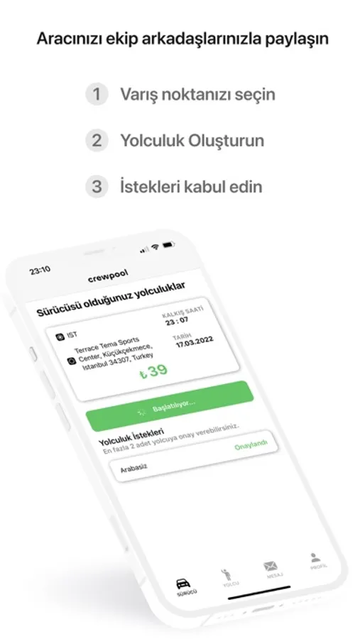 Crewpool 'da sürücü uygulamasını kullanarak evine dönmek isteyen arkadaşlarını en yakın yere veya evlerine bırakabilirsin!