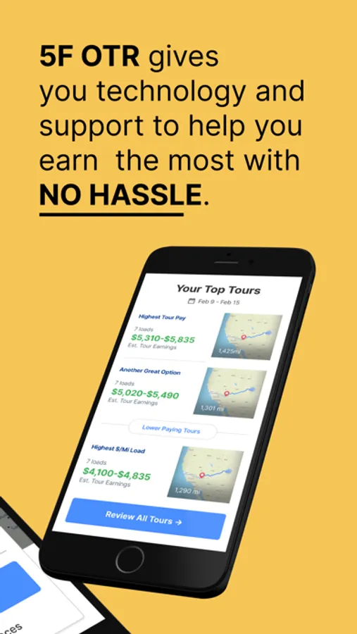 5F OTR provides drivers and owner operators with access to network of Over The Road work across North America. Customize your hauling preferences and our AI recommends multiple payloads leading you to the highest paying markets.