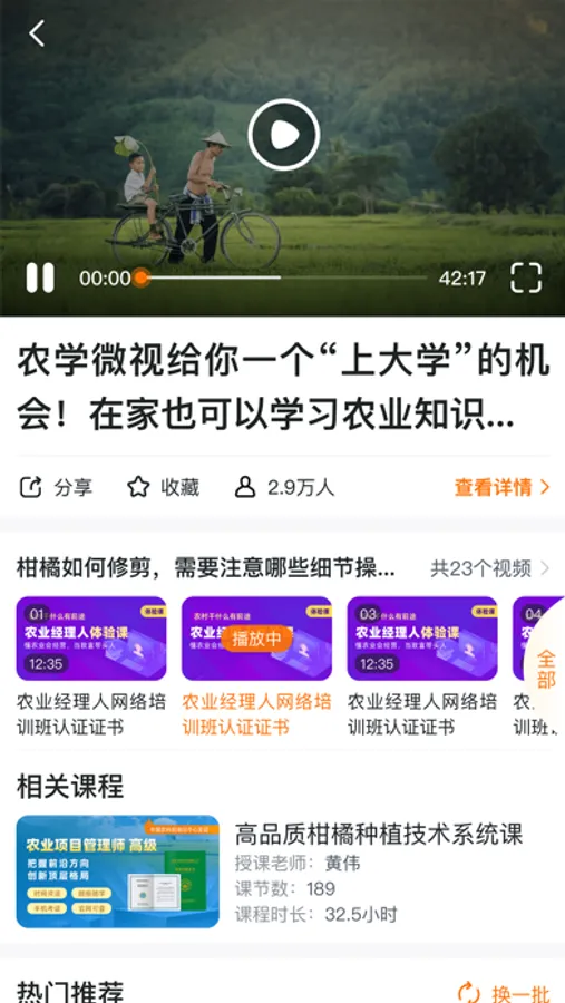 课程:天天学农App提供了精品农业课程,由专业的讲师和机构制作,内容权威、实用、有趣。用户可以根据自己的兴趣和需求,选择合适的课程进行学习,也可以收藏和分享自己喜欢的课程。