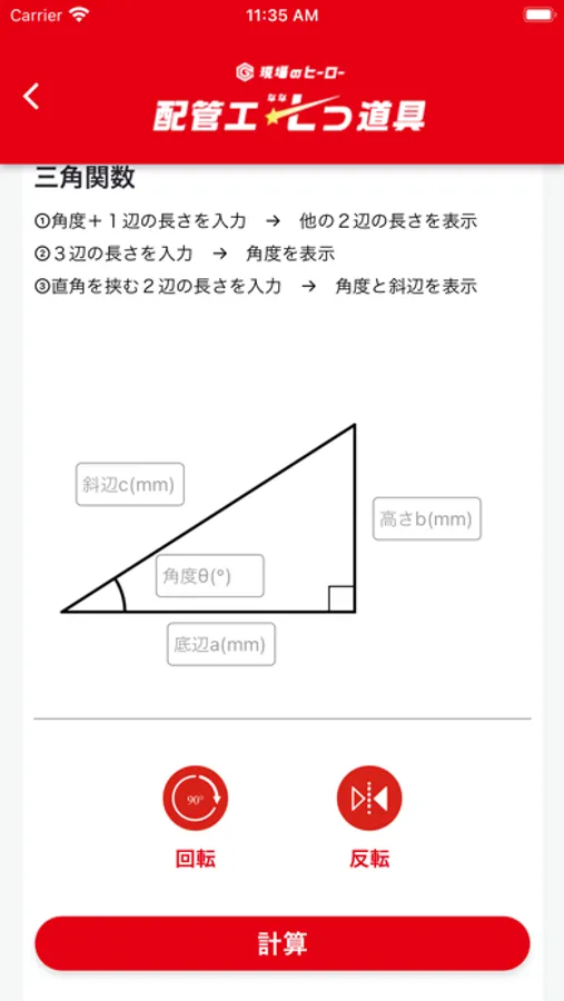 「配管工七つ道具」は、配管などの寸法をスマホでカンタンに計算できる配管工職人向けのアプリケーションです。
