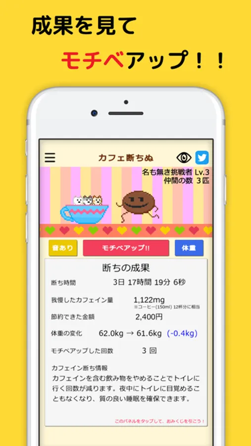 3.さまざまなカフェイン断ちのデータが、自動計算されて「努力の成果」として表示されます
