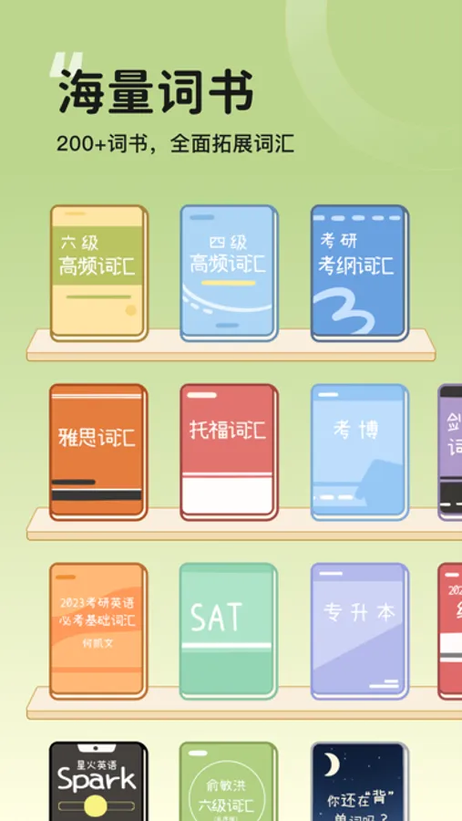 ● 海量词库:四级/六级/考研/托福/雅思/托业/计算机/BEC/SAT/GRE/GMAT...权威词库让你挑选,让学习更舒心
