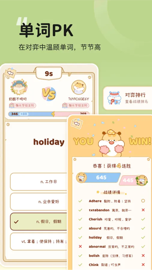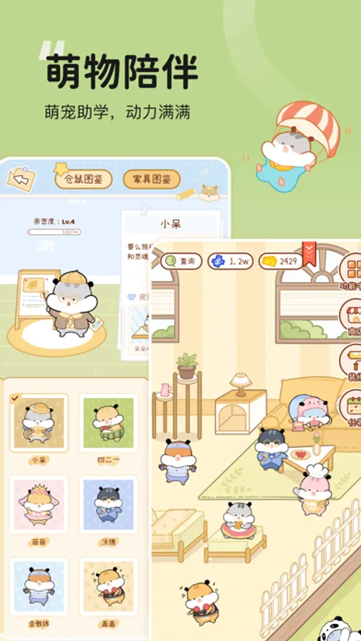 《奶酪单词》是一款以学习和养成为主题的趣味背单词软件,每当你认真完成单词记忆后,即可召唤出仓鼠神兽,用萌宠击败懒惰!开始你记单词的自律之旅吧!