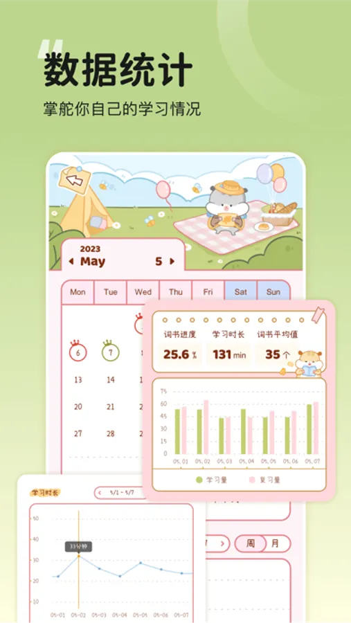 ● 记得牢:拥有最全的词根词缀,按五个格子记忆法和艾宾浩斯遗忘曲线同时定期复习,萌鼠每日上线提醒你打卡