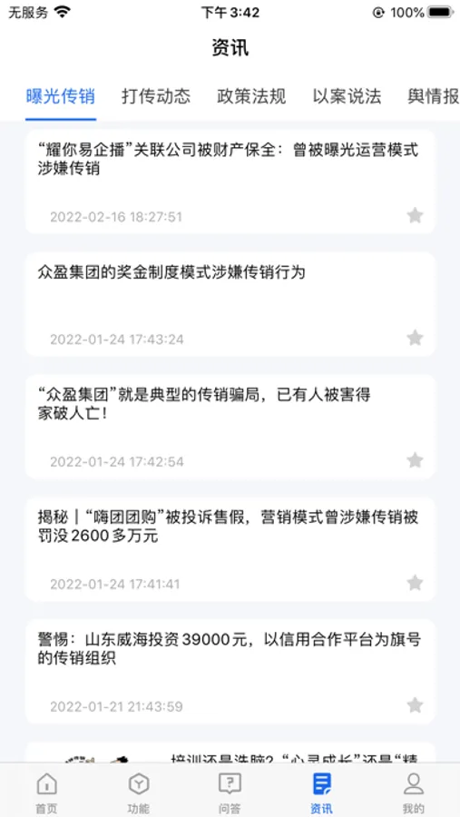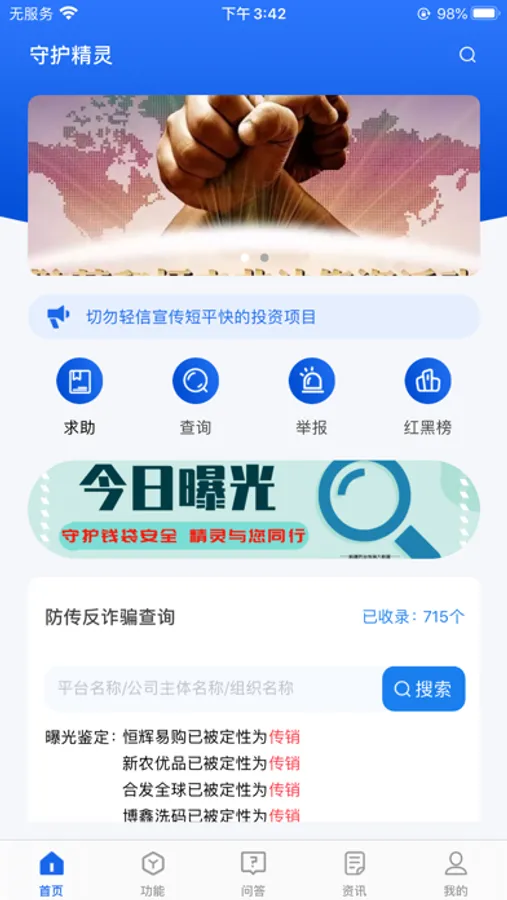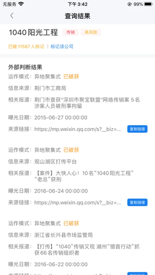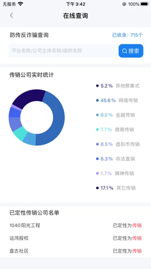 1、在线查询:对非法传销的组织公司进行名称查询,查看其标记次数、运作模式、相关报道等信息