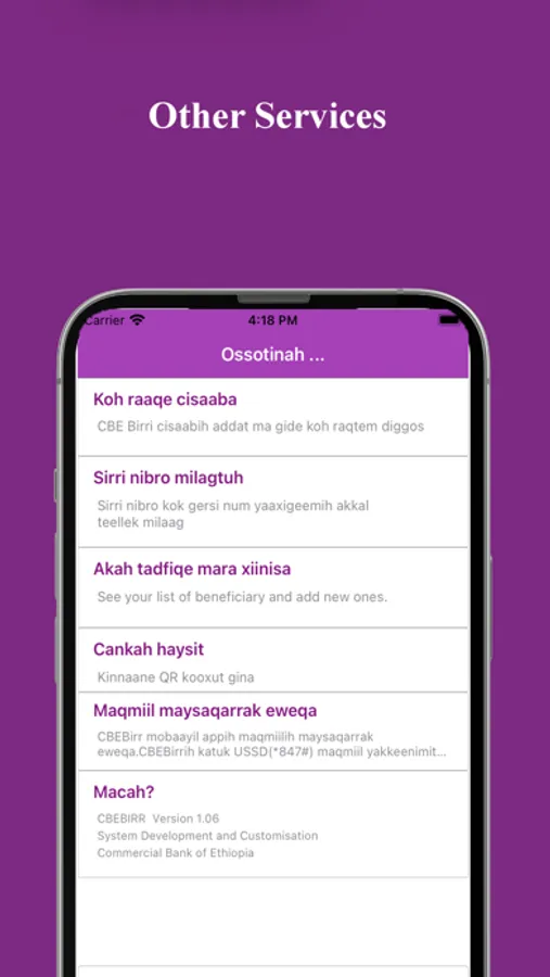 This application, CBEBirr is a commercial application that is to be used by the customers of Commercial Bank of Ethiopia (CBE) for money transfer, top up, pay bills and other services. This application do not need a login but it needs a verification process. The main CBE Birr functionality includes: