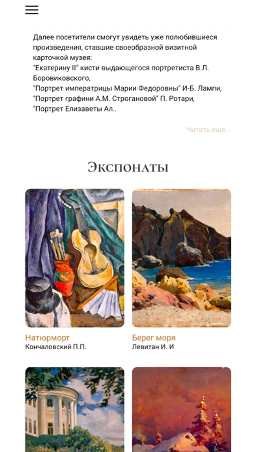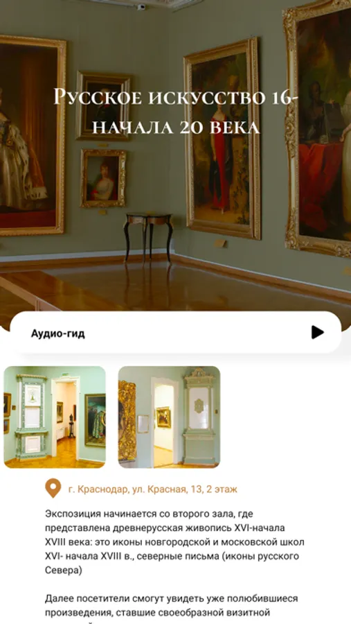 Мобильное приложение позволяет изучать экспонаты и экспозиции, при помощи встроенного аудиогида, а также текстового описания.
