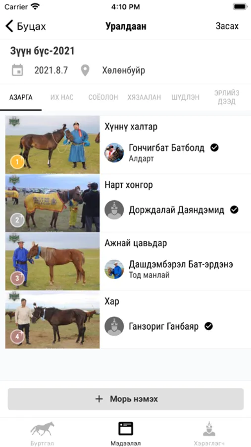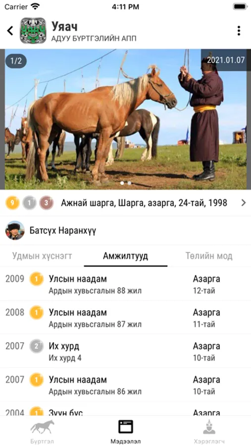 Амжилт бүртгэх: Хурдан хүлгийнхээ уралдсан түүх, эзэлсэн байрыг он оноор оруулж түүх үүсгээрэй.